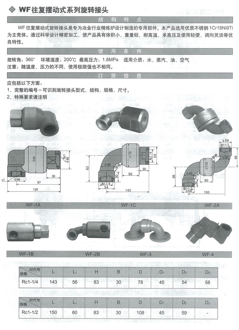 產(chǎn)品簡介:結(jié)構(gòu)特點: WF往復擺動式旋轉(zhuǎn)接頭是專為冶金行業(yè)精煉爐設(shè)計制造的專用部件。本產(chǎn)品選用優(yōu)質(zhì)不銹鋼1Cr18Ni9Ti為主殼體。通過科學設(shè)計精密加工,使產(chǎn)品具有體積小、重量輕、耐高溫、承高壓及使用輕便、調(diào)向靈活等優(yōu)良特性。 使用條件: 旋轉(zhuǎn)角:360° 環(huán)境溫度:200℃ 最高壓力:1.8MPa 適用介質(zhì):水、蒸汽、油、空氣 注意:隨溫度、壓力的不同,使用極限值也不相同。 ...